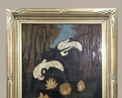 Art Deco style frame with lily motifs carved in to the corners. Water gilded with 12 Kt. white gold leaf. Displaying an original work by Anna Heyward Taylor, private collection.