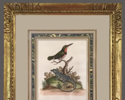 Carved corner reproduction frame with corner accents and water gilded with 22 Kt. gold leaf. installed with a hand-drawn French mat with marbling. Displaying a hand-colored etching by Mark Catesby.
