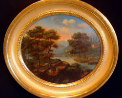 Oval frame, handcrafted from raw wood. Cove interior and water gilded with 22Kt. gold leaf. Displaying a period painting.