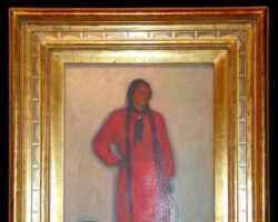 Taos, American Western / Native American style frame with liner. 22Kt gold leaf over rouge bole, raised 12Kt gold leaf ornamentation. Displaying an original work by Bert Greer Phillips.