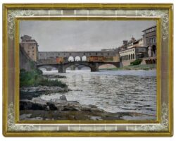 Italian Casetta style frame with sgraffito corners, water gilded with 22 Kt. yellow gold leaf and 12 Kt. white gold leaf. Displaying an original oil by D. Akhriev.