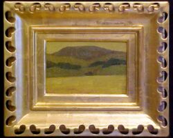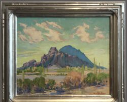 Curved corner frame with carved interior and exterior accents, water gilded with 12Kt. white gold leaf. Displaying "Purple Butte Arizona: by Jesse Benton Evans, and Oil on canvas, 20 x 24 in. This piece is part of the permanent collection of the Huntsville Museum of Art