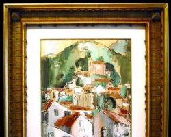 1930s Depresion era style frame for William Halsey watercolor original, Taxco, Mexico. Carved and stained basswood interior, 22Kt gold leaf with inner and outer crowns.