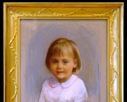 John Singer Sargent inspired frame. Blending American underneath English and Italian styles, this special frame has a taste of every nation which John Singer Sargent loved. Commissioned by nationally acclaimed portrait artist, Bart Lindstrom, this spectacular frame is 8″ wide (but can be made any width), and incorportates reeds, coves, fluted coves, crossed ribbons and scrolled acanthus corners. Gilded with 22Kt gold leaf over rouge bole.