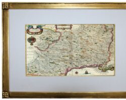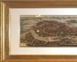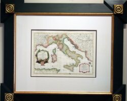 Italian Cassetta style frame with sgraffito design etched into corners. 12Kt white gold leaf entablature with 22Kt gold leaf crown and lip. Designed for this restored antique Venetian map.