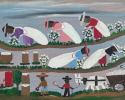 But she preferred the folk art style. From that time, she was prolific, and created over four-thousand scenes of plantation life on whatever materials were available from scrap wood to paper bags. She thinned her oil paint so much it resembled watercolor. She sold many of her first works for a dime or quarter to pay for her husband’s medical treatment.